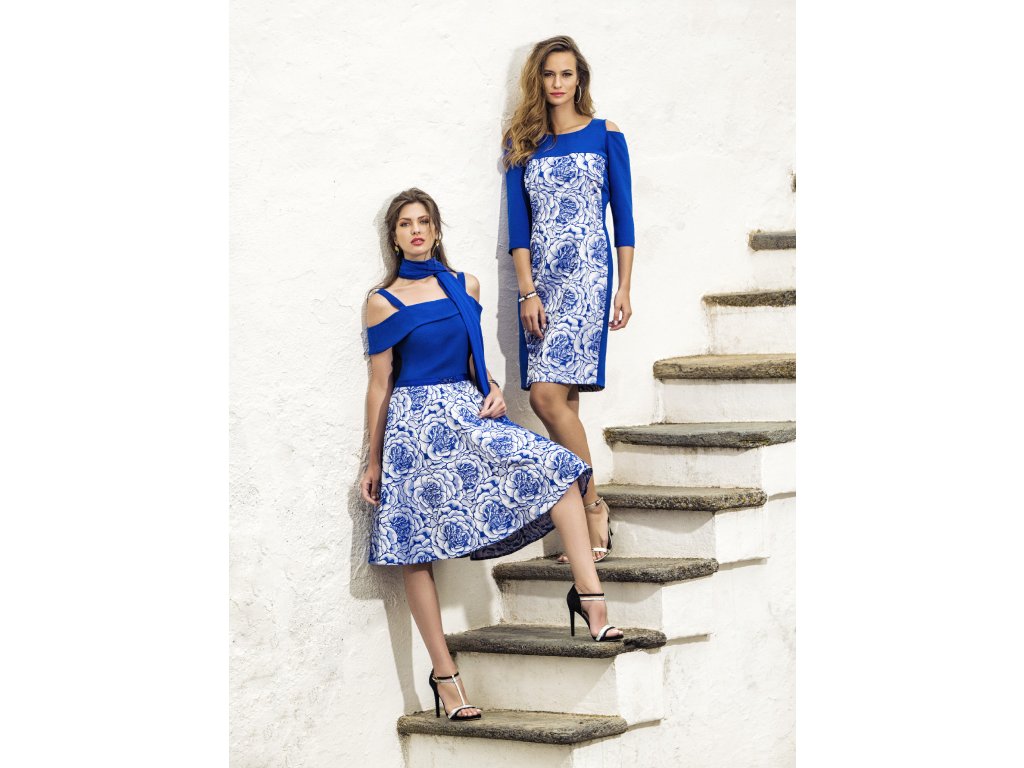 Šaty mají délku po kolena a 3/4 rukávy. Průstřihy na ramenou dodávají nositelce šmrnc. Střední část má moderní modrobílý potisk. Na bocích jsou pruhy z modré látky, díky kterým šaty opticky zužují postavu.