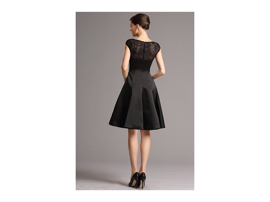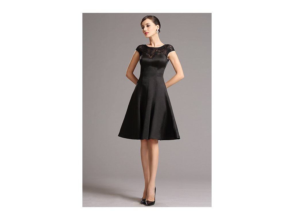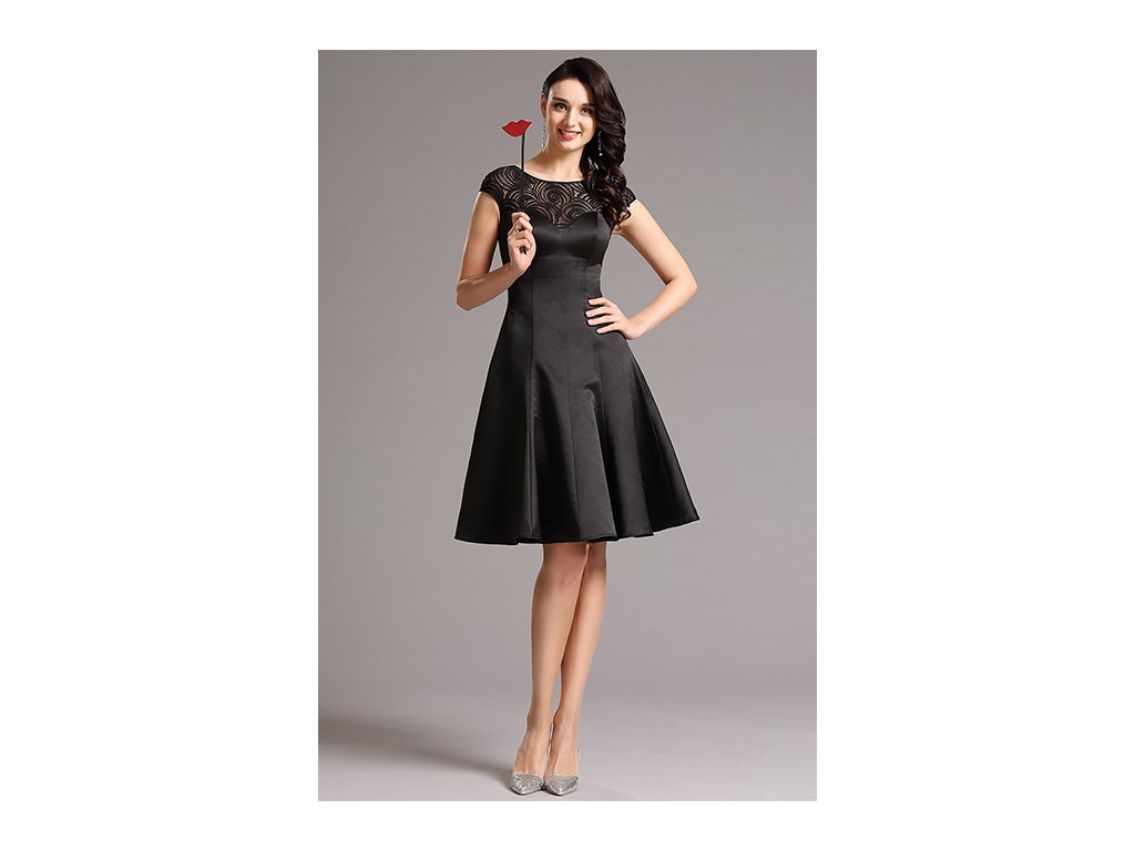 Krátké šaty princesového střihu jsou ušity z pevného saténu, který drží tvar. Dekolt je z krajky stejné barvy.
