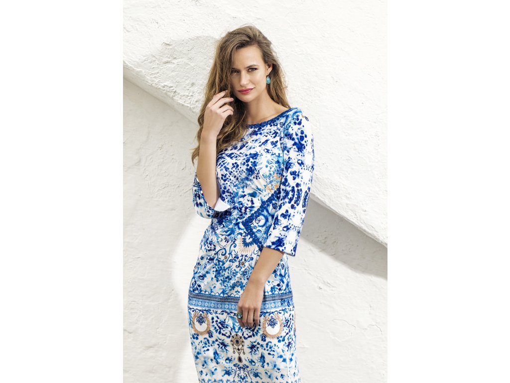Zajímavé šaty z příjemného mírně pružného materiálu. Šaty mají moderní modrobílý vzorek, 3/4 rukávy a lodičkový výstřih. Na bříšku mají mírné řasení, díky němuž skvěle padnou mnoha typům postavy.